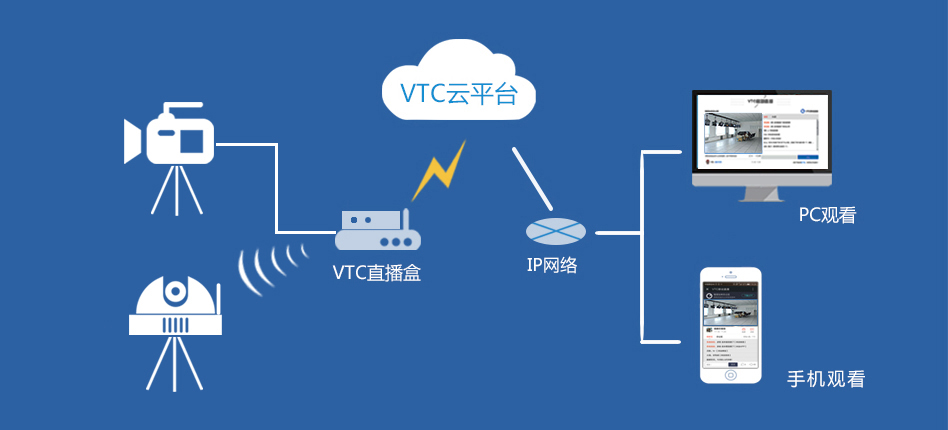 VTC提供多种直播方案,有标准的专业摄像头、摄像机直播方案(如图1),还提供定制的直播方案, 如多路视频导播台切换直播的方案(如图2),如需了解更多直播方案,请拨打咨询热线。